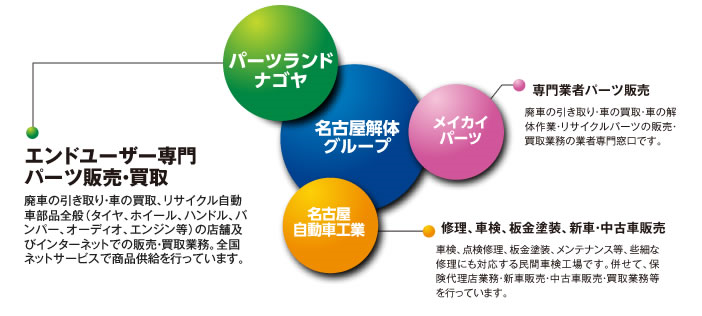 名古屋解体グループは、21世紀にふさわしい企業として「地球環境にも財布にもやさしい」をモットーに、トータルカーリサイクルターミナルを目指しています。